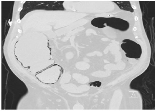 • Imaging: Chest X-ray showed hyperinflation without acute infiltrates. CT scan revealed pneumatosis coli involving the cecum and ascending colon, with no evidence of perforation or free air.