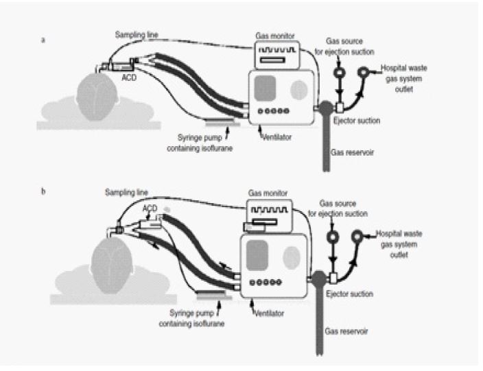 The device (Figure 1) is a modified heat and moisture exchanger that can be integrated into the breathing circuit in two configurations: either connected to the Y-piece (Figure 2a) or positioned in the inspiratory limb (Figure 2b). The system facilitates the delivery of isoflurane or sevoflurane via a syringe pump. The gas is vaporized within the AnaConDa and incorporated into the inspired gas mixture. When positioned at the Y-piece, approximately 90% of exhaled gas is captured by a carbon filter within the device and re-inspired by the patient due to concentration gradients. This rebreathing mechanism significantly reduces isoflurane consumption, limiting it to the amount metabolized and a small portion released to the scavenging system. Alternatively, when placed in the inspiratory limb, the rebreathing function is lost, but this configuration avoids the addition of dead space at the Y-piece, which may benefit smaller patients [5-12].