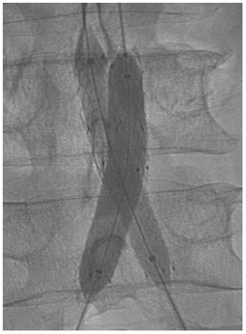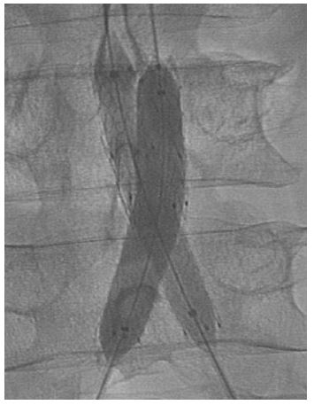 A male patient, 70 years, with hypertension and dyslipidemia, was admitted with an asymptomatic infrarenal abdominal aortic saccular aneurysm, measuring 3,6 cm. The patient was submitted to endovascular treatment with the aortic implant of endoprosthesis Jotec E-Tegra® 22×22×80 mm, followed by implant of Wrapsody 60×12×120 mm at left common iliac artery and Wrapsody 60×12×120 mm right common iliac artery, communicating with the aortic endoprosthesis. After that, it was performed a kissing balloon at both common iliac arteries with a catheter balloon 10x60 mm. The final image showed excellent results with no endoleaks. (Figure 1). The patient was discharged from the hospital on the first day post-operative and 1-month follow-up showed endoprosthesis patency with no endoleaks.