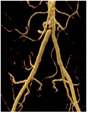 A male patient, 61 years old, obese, active smoker, with arterial hypertension and diabetes, was admitted with right inferior disabling claudication. AngioCT-Scan showed distal aorta and right iliac common artery stenosis (Figure 5). The patient was scheduled to undergo endovascular surgery with Covered Endovascular Reconstruction of Aortic Bifurcation (CERAB) technique, using Wrapsody 16x40 mm implanted at distal aorta, Wrapsody 10×50 mm implanted at distal aorta and left common iliac artery associated to Wrapsody 9×50 mm at distal aorta and right common iliac artery, followed by post-dilatation with catheter balloon. The patient was discharged from the hospital first day post-operative and 1-month follow-up showed endoprosthesis patency with complete resolution of the previous symptoms.