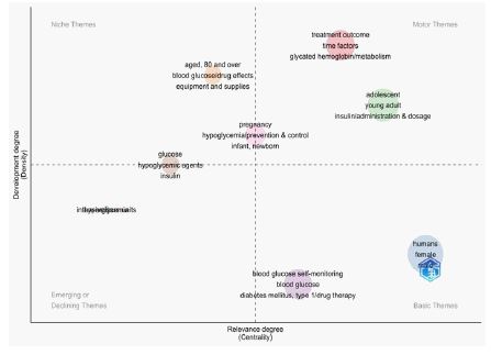 Finally, basic themes in the bottom-right quadrant are foundational concepts with high relevance but low internal development. These include humans, females, males, blood glucose self-monitoring, and diabetes mellitus type 1/drug therapy. These themes serve as essential frameworks that support broader research but are not highly specialized. Increasing their density through further study could enhance the overall depth and quality of research in the field.