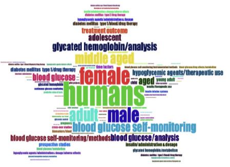 In Figure 9, the top-10 frequently used keywords were listed to explain keyword co-occurrence. Keywords such as “human” (77), “female” (55), “male” (48), “adult” (42), “middle aged” (36), “blood glucose self-monitoring” (31), “glycated hemoglobin/analysis” (26), “aged” (24), “blood glucose” (23), and “adolescent” (22)” were reportedly the most frequently used keywords by authors.