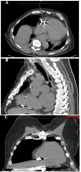 An 87-year-old man with an underlying history of coronary artery disease post coronary artery bypass graft, mitral valve replacement, moderate aortic stenosis, chronic right-sided heart failure, bronchial asthma, and atrial fibrillation initially presented with dyspnea and features of right heart strain on transthoracic echocardiogram. This was believed to be related to the development of intrahepatic porto-hepatic venous shunts from spontaneous portosystemic venous malformations, the largest of which was 4 centimeters. He had initially presented to the interventional radiology department for shunt embolization via coiling. The procedure was complicated by one of the coils migrating to the right ventricle. CT Thorax was performed to as sess the location of coil migration, and it revealed the coil to be deep in the anterior aspect of the right ventricle (Figure 1).
