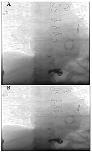 Foreign bodies in the right side of the heart pose potential complications, including infective endocarditis, thrombosis, pulmonary embolism, pulmonary infarct, erosion, perforation and tamponade, arrhythmia or conduction disturbances, paradoxical embolization, and in rare circumstances, possible cardiopulmonary arrest [5]. Experts recommend early removal of intracardiac foreign bodies to prevent complications, even if clinically silent. Methods of removal can be a percutaneous approach under IR guidance or via open heart surgery. In our case, the patient was considered to be at high surgical risk given his multiple comorbid conditions and could not be anticoagulated because of the complication of hematuria. He was, therefore, managed conservatively, and this has been described in the literature in the case of small and smooth foreign bodies. Tonkin et al. described two instances of coil migration to the tricuspid valve and pulmonary arteries with coil fragments in the right ventricle, which was asymptomatic and was managed conservatively [6]. In conclusion, coil migration is a rare complication of portosystemic shunt coil embolization. Failure of coil retrieval is rare, and further effort in retrieval via open heart surgery has to be weighed on a case-by-case basis based on the patient’s comorbidities and associated risks.