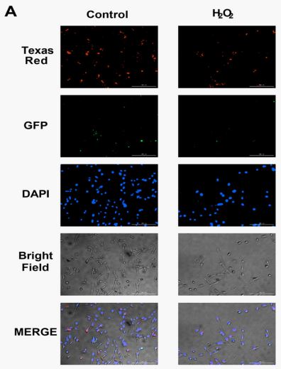 The steps of cell grouping and oxidative stress modeling were the same as 2.6, using the mitochondrial membrane potential detection kit (JC-1) (Beyotime), adding JC-1 working solution 500 μL /well, incubating the cells for 30 L /well, incubating the cells for 30 min at 37OC, avoiding light, washing twice with JC-1 buffer, and taking observation photos using the fully automated intelligent imaging analysis system.