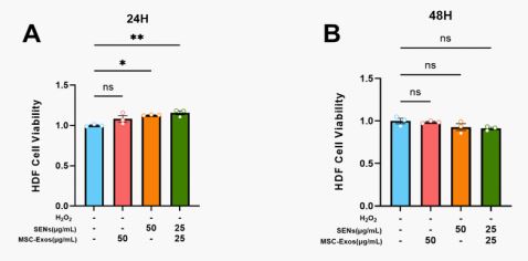 To evaluate the cytotoxic effects of MSC-Exos and SENs on HDFs, cell viability was detected at 24 and 48 h after treatment in this study. The experimental results showed that neither MSC-Exos nor SENs exhibited cytotoxicity in the set concentration range. In addition, at 24h, SENs alone and in combination presented cell proliferation promotion, indicating that MSCExos and SENs not only have good biocompatibility, but also promote the proliferation of HDFs to a certain extent.