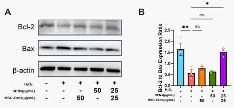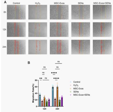 This study showed that both MSC-Exos and SENs could improve H₂O₂-induced oxidative stress damage, and MSC-Exos played a significant role in promoting cell migration, while SENs mainly played an antioxidant role. The combination of the two has a synergistic effect in promoting cell proliferation, reducing ROS level, restoring mitochondrial membrane potential and regulating the BCL-2/BAX ratio, which provides a new research direction for the combined application of exosomes.