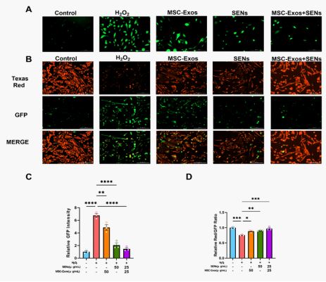 This study investigates the reparative effects of MSC-Exos and SENs in an oxidative stress model. We treated H₂O₂-injured Human Dermal Fibroblasts (HDFs) with MSC-Exos and SENs, either alone or in combination, and evaluated their impacts on cell proliferation, ROS clearance, mitochondrial function, migration, and anti-apoptotic pathways.