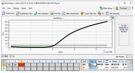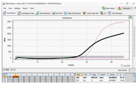 The Mucor-Genius® Real-Time PCR Kit had been validated on real-time PCR instruments such as the CFX96 and C1000 thermal cyclers, utilizing different fluorescence detection channels. For optimal detection, the HEX dye was employed for Mucorales spp., and the CY5 dye was used for the internal control (IC), with appropriate filter settings applied to their respective channels.