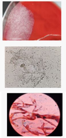 The impact of SARS-CoV-2 infection on the incidence and severity of mucormycosis has been significant during the second wave of the COVID-19 pandemic when infections were mainly due to Delta strain of the virus. Mucormycosis, commonly referred to as black fungus, is a rare but aggressive fungal infection caused by moulds belonging to the order Mucorales, which are found in soil, decaying organic matter, and animal dung [1,2]. While typically harmless to healthy individuals, it can become life-threatening in immunocompromised patients. Several interrelated factors contribute to the heightened risk of mucormycosis in COVID-19 patients. COVID-19 infection triggers a cytokine storm, especially an increase in Interleukin-6 (IL-6), which raises ferritin levels and disrupts iron metabolism, leading to excess free iron. This promotes the formation of Reactive Oxygen Species (ROS), fostering an environment conducive to fungal growth. In parallel, COVID-19 may cause acute hyperglycaemia, new-onset diabetes, hypoxia, lymphopenia, reduced CD4+/CD8+ T cells, and metabolic acidosis—all of which compromise immune defences [3,4]. The use of corticosteroids in managing severe COVID-19 can worsen hyperglycaemia, suppress immune function, and increase ferritin and ROS levels, further enhancing susceptibility to fungal infections. Patients with pre-existing diabetes are at particular risk, as chronic hyperglycaemia and Diabetic Ketoacidosis (DKA) create acidic environments that facilitate fungal proliferation. During DKA, the endothelial receptor GRP78 and fungal CotH proteins are upregulated, promoting adhesion and tissue invasion by Mucorales [5]. Without prompt antifungal therapy, the fungal load can double within hours, making early diagnosis critical. During the pandemic, the rapid progression of mucormycosis significantly increased mortality rates, especially in patients with comorbidities such as diabetes mellitus, renal disease, and haematological malignancies like leukaemia and lymphoma. In addition to individuals with COVID-19 and diabetes, several other groups are particularly vulnerable to mucormycosis due to compromised immune defences [6,7]. These include patients undergo ing chemotherapy or those who have received organ or stem cell transplants, as their immune systems are often significantly suppressed with prolonged neutropenia. Long-term corticosteroid therapy can impair the immune response and elevate blood sugar levels, creating favourable conditions for fungal growth. Patients with chronic kidney disease often have weakened immunity and may undergo treatments that increase susceptibility to opportunistic infections. Rhino-Cerebral Mucormycosis primarily affects the sinuses, eyes, and brain and is most commonly seen in individuals with uncontrolled diabetes or Diabetic Ketoacidosis (DKA). Early symptoms include nasal congestion, black discharge from the nose, facial pain or swelling, vision disturbances, and altered mental status. If not treated promptly, the infection can progress rapidly and may be fatal [8]. Pulmonary Mucormycosis involvement is typically seen in patients with weakened immune systems, such as those undergoing chemotherapy or organ transplantation. The infection targets the lungs, causing symptoms like fever, persistent cough, chest pain, shortness of breath, and haemoptysis. This form can closely resemble other respiratory infections like tuberculosis or aspergillosis, making diagnosis challenging [9]. A rare but serious form, gastrointestinal mucormycosis is mainly observed in premature infants and critically ill adults. It commonly affects the stomach or intestines and presents with symptoms such as abdominal pain, vomiting, gastrointestinal bleeding, and abdominal distension. Without timely intervention, the condition carries a high risk of mortality [10]. Cutaneous mucormycosis occurs when fungal spores enter the body through breaks in the skin, such as cuts, burns, surgical wounds, or trauma. It manifests as redness, swelling, pain, ulceration, and black necrotic lesions at the site of infection. If not treated effectively, the fungus can spread to deeper tissues and potentially become systemic [11]. The most severe form of the disease, disseminated mucormycosis occurs when the infection spreads through the bloodstream to multiple organs, including the brain, heart, spleen, and skin. Symptoms vary depending on the organs affected and often indicate severe systemic involvement. This form is associated with a very poor prognosis and requires urgent, aggressive treatment [12]. Absidia produces relatively small sporangia that are round to pear-shaped and are held on a distinctive funnel-shaped structure called an apophysis. This feature differentiates Absidia from the genera Mucor and Rhizomucor, which possess larger, globose sporangia lacking an apophysis. There are 21 known species in the Absidia genus, and most of them live in soil. Among them, Absidia corymbifera is a recognized opportunistic human pathogen, capable of causing various forms of zygomycosis, including pulmonary, rhinocerebral, disseminated, Central Nervous System (CNS), and cutaneous infections [13]. The genus Cunninghamella is characterized by rapidly growing colonies that range in colour from white to grey. These colonies produce straight, upright, branching sporangiophores. At their tips, the sporangiophores terminate in globose (round) or pyriform (pear-shaped) vesicles. These vesicles give rise to multiple single-celled, round to oval sporangiola, which form on swollen projections. The sporangiola may have smooth or spiny (echinulate) walls. In addition, chlamydospores and zygospores may also be present. Colonies grow very quickly, appearing white initially and gradually turning dark grey and powdery as sporangiola form. Sporangiophores can reach up to 20 µm in width and may be straight with either solitary or verticillate (whorled) branches. Terminal vesicles are sub globose to pyriform an