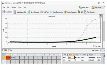 A 41-year-old male patient with a known history of post-COVID-19 infection, underlying diabetes mellitus, and a pre-existing kidney disorder was clinically diagnosed with mucormycosis, confirmed through microbiological analysis of two distinct clinical specimens. The first specimen, serum, demonstrated a cycle Threshold (CT) value of 28.09 (Figure 5), while the second specimen, sputum, showed a comparatively lower CT value of 25.2, indicating a relatively higher fungal load in the respiratory tract and signifying an active and possibly progressing infection. Further laboratory investigations revealed a markedly elevated Total leukocyte Count (TC) of 20,000, which is indicative of a significant inflammatory or infectious response, and a decreased Haemoglobin percentage (HB%) of 8.4, suggesting anaemia that may contribute to reduced oxygen-carrying capacity, tissue hypoxia, and overall physiological compromise. These haematological derangements, when combined with the patient’s comorbid conditions and immunosuppressive state due to both diabetes and renal dysfunction, place him at heightened risk for poor outcomes, underscoring the urgency for aggressive antifungal therapy, glycaemic control, and multidisciplinary management.