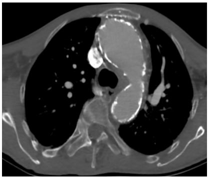 A 56-year-old man was admitted for surgery to treat severe aortic insufficiency. He had a medical history of Behçet’s disease, hypertension, and chronic aortic regurgitation. An elective aortic valve replacement was planned for him. A chest computed tomography performed as part of the preoperative evaluation revealed a surprising amount of circumferential calcification of the ascending aorta, which is consistent with a porcelain aorta (Figure 1).