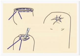 The patient was transferred to the OR, with no disturbances in vital signs. Under general anesthesia, intubation was done and monitoring lines attached. Before giving the incision, dynamic fluoroscopy was done, it was noted that the needle was rhythmically moving, raising the suspicion of it being in a vital structure. Thoracic surgeon was asked to take over, moving forward. Surgical access was gained through a sub-xiphoid incision extending cranially towards the sternum. The xiphoid itself was cut, and sternotomy was done till the body of sternum. Tissue dissection was done till the pericardium. The pericardium was opened, and 30 ml of blood was visible in the pericardial cavity. The foreign body was found penetrating the right Ventricle, with just 2-3 mm visible over the heart. Purse string sutures (Figure 3) were taken being passed through pledgets. The needle was successfully removed using a curved artery forceps, with simultaneous tying of the sutures. The pericardium was irrigated with normal saline 0.9%, a drain was placed, and closing of the structures was done layer by layer. The surgery was uneventful and successful. The patient was shifted to the pediatric intensive care unit for monitoring, with the step-down of the patient in the general ward on the second post-operative day. The drain was removed on the third post-operative day, with findings of 10-15 ml of serosanguinous fluid. She was discharged on the fourth post-operative day with no adverse outcomes.