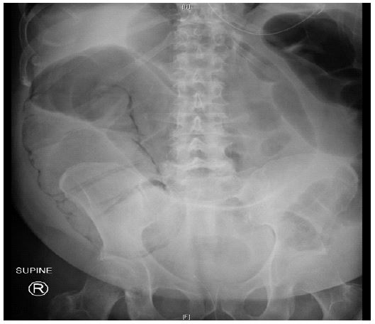 The absence of peritoneal signs, normal lactic acid levels, and imaging findings without evidence of perforation or free air supported the diagnosis of PCI in this case. The mildly elevated white blood cell count was likely multifactorial, secondary to the COPD exacerbation, systemic inflammation, and steroid use [3,4].
