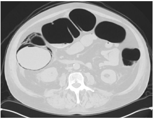 Patient was admitted to medical ICU. Despite initial management, the patient’s respiratory status deteriorated, necessitating intubation and mechanical ventilation. During his ICU stay, his cultures remained negative, he developed high tube feeding residuals, mild abdominal distension without peritoneal signs. Repeat lactic acid was normal. Abdominal x-ray, CT abdomen and pelvis showed pneumatosis in the wall of the cecum and ascending colon. In context of his clinical findings, the patient was managed conservatively with bowel rest, close monitoring, and optimization of his respiratory status.