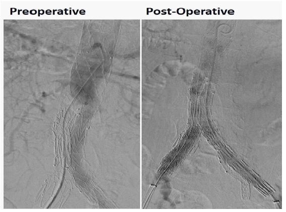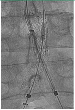 Male patient, 76 years, with a history of Endovascular repair of Aortic Abdominal Aneurysm (EVAR) evolved with endoprosthesis right limb occlusion, associated with disabling claudication. Due to this important symptom, the patient was scheduled to undergo an endovascular procedure with right limb recanalization and implant of Wrapsody 14×80 mm at the infra-renal aorta and right common iliac artery, followed by the implant of Wrapsody 14×80 mm at the right common iliac artery and another Wrapsody 16×80 mm at iliac bifurcation (Snorkel Technique). The left limb was also treated to perform a Kissing Stent with the implant of Viabahn 13×100 mm. (Figure 2). The patient was discharged from the hospital first day post-operative and 1 one-month follow-up showed endoprosthesis patency and no endoleaks with complete resolution of the previous disabling claudication.