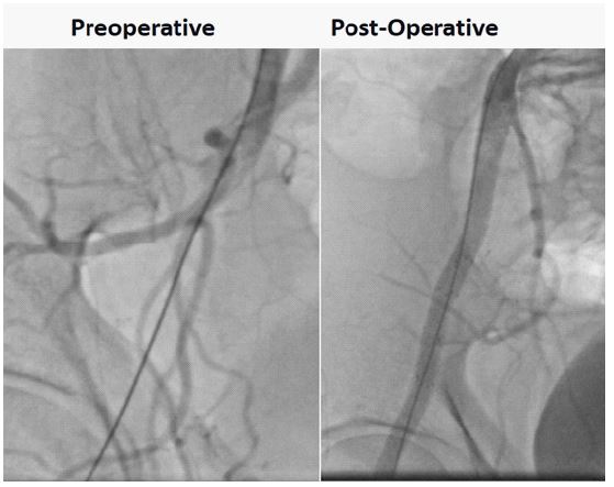 A male patient, 59 years old, with arterial hypertension, ischemic heart disease, active smoker was admitted with left inferior limb disabling claudication. AngioCT-Scan showed distal aorta and complete left iliac common and external artery occlusion. The patient was submitted to left femoral common artery endarterectomy and profundoplasty followed by complete recanalization of the left iliac common and external artery occlusion with Wrapsody 8×125 mm and 7×75 mm respectively. (Figure 6). The patient was discharged from the hospital second day post-operative and 1-month follow-up showed endoprosthesis patency with complete resolution of the previous symptoms.