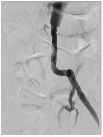 A male patient, 61 years old, obese, active smoker, with arterial hypertension and diabetes, was admitted with right inferior disabling claudication. AngioCT-Scan showed distal aorta and right iliac common artery stenosis (Figure 5). The patient was scheduled to undergo endovascular surgery with Covered Endovascular Reconstruction of Aortic Bifurcation (CERAB) technique, using Wrapsody 16x40 mm implanted at distal aorta, Wrapsody 10×50 mm implanted at distal aorta and left common iliac artery associated to Wrapsody 9×50 mm at distal aorta and right common iliac artery, followed by post-dilatation with catheter balloon. The patient was discharged from the hospital first day post-operative and 1-month follow-up showed endoprosthesis patency with complete resolution of the previous symptoms.