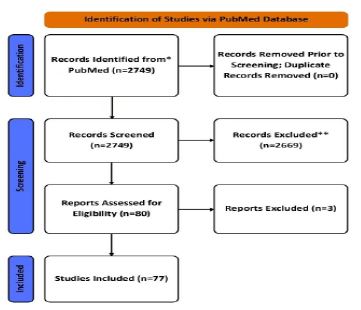 After retrieving relevant articles from PubMed, we extracted bibliographic data into a text file. This data encompassed publication years, author names, journal titles, article titles, abstracts, and keywords. We ensured the absence of duplicate articles. Subsequently, we manually inspected the extracted bibliographic data for articles on the clinical use of CGM in diabetes mellitus; these clinical use encompass various aspects such as improvements in blood glucose control following CGM use, reduction in HbA1C and glycemic excursion following the adoption of CGMs, increase in target “time in range” since the adoption of CGMs, the utilization and interpretation of CGM-related metrics, and the integration of CGM with artificial pancreas (closed-loop systems). Documents outside the research scope; papers on the clinical or technical performance of CGMs, protocols, clinical trials not focused on the clinical use of Continuous glucose monitoring systems, and unrelated research topics were excluded. Following manual screening, a total of 77 papers were included in the bibliometric analysis.