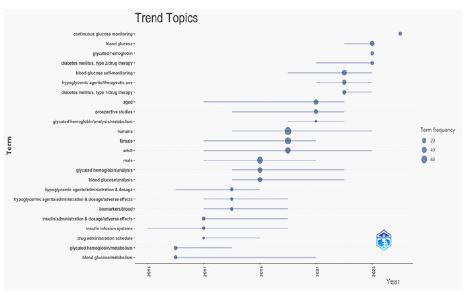 Overall, these findings demonstrate a consistent interest in investigating glucose monitoring, blood glucose, type 2 diabetes, and glycated haemoglobin over time, with a notable change in methods of monitoring explored and specific areas of attention within each year (Figure 4).