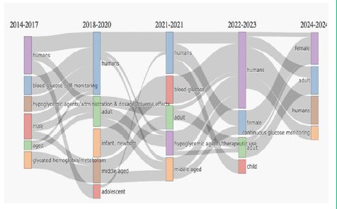 Figure 5 depicts the most used terms during various periods. Before 2018, the most frequently used terms were aged, humans, blood glucose self-monitoring, hypoglycemic agents/ administration & dosage/adverse events, male and glycated hemoglobin/metabolism. These keywords indicate a research focus on a foundational understanding of diabetes and mitigating its impact on glycated hemoglobin metabolism using blood glucose monitoring methods and hypoglycemic agents.