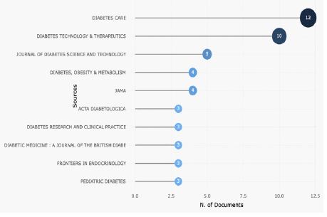 The most relevant sources in terms of the number of clinical trials on the topic is “DIABETES CARE” (12 publications) followed by “DIABETES TECHNOLOGY & THERAPEUTICS” (10 publications). The top 10 most relevant journals are illustrated below in Figure 8.