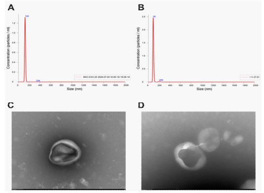 Preparation for MSC-Exos: Collect the MSC culture supernatant and use the stem cell culture medium exosome extraction kit (Shifangjie S909) for the extraction of MSC-Exos. Place the collected MSC culture supernatant on ice, centrifuge at 6500g for 10 minutes to remove residual cells; collect the supernatant and centrifuge at 10000g for 10 minutes to remove cell debris. Transfer the supernatant to a new centrifuge tube and add Isolation Reagent A at a volume ratio of 2:1 (V-sample: V-A=2:1); invert and mix 3-5 times, then let it sit at 4°C for 5 minutes, followed by centrifugation at 13500 g for 3 minutes. Transfer the supernatant to a new centrifuge tube and add Isolation Reagent C at a volume ratio of 3:1; invert and mix 3-5 times, then let it sit at 4OC for 1 hour, followed by centrifugation at 13500 g for 30 minutes. Discard the supernatant and collect the precipitate, which is the exosome; resuspend the precipitate in 500μL of physiological saline (or resuspension solution for downstream experiments) L of physiological saline (or resuspension solution for downstream experiments) according to subsequent experiments. Centrifuge the resuspended exosome solution at 5000 g for 10 minutes, discard the precipitate, and finally use the obtained exosomes for subsequent experiments or store them at -80OC after aliquoting. (The refrigerated high-speed centrifuge used for centrifugation is Xiangyi H1580R.)