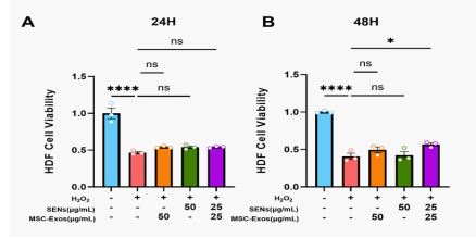 This study investigates the reparative effects of MSC-Exos and SENs in an oxidative stress model. We treated H₂O₂-injured Human Dermal Fibroblasts (HDFs) with MSC-Exos and SENs, either alone or in combination, and evaluated their impacts on cell proliferation, ROS clearance, mitochondrial function, migration, and anti-apoptotic pathways.