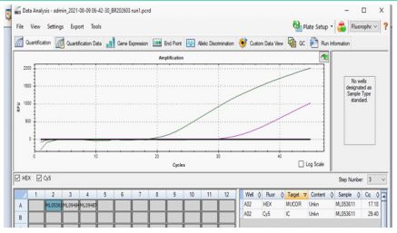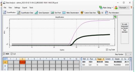 A 41-year-old male patient with a known history of post-COVID-19 infection, underlying diabetes mellitus, and a pre-existing kidney disorder was clinically diagnosed with mucormycosis, confirmed through microbiological analysis of two distinct clinical specimens. The first specimen, serum, demonstrated a cycle Threshold (CT) value of 28.09 (Figure 5), while the second specimen, sputum, showed a comparatively lower CT value of 25.2, indicating a relatively higher fungal load in the respiratory tract and signifying an active and possibly progressing infection. Further laboratory investigations revealed a markedly elevated Total leukocyte Count (TC) of 20,000, which is indicative of a significant inflammatory or infectious response, and a decreased Haemoglobin percentage (HB%) of 8.4, suggesting anaemia that may contribute to reduced oxygen-carrying capacity, tissue hypoxia, and overall physiological compromise. These haematological derangements, when combined with the patient’s comorbid conditions and immunosuppressive state due to both diabetes and renal dysfunction, place him at heightened risk for poor outcomes, underscoring the urgency for aggressive antifungal therapy, glycaemic control, and multidisciplinary management.