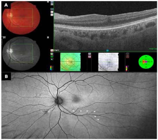 On post-operative examination, his retina was fully attached and ocular motility full. Optical Coherence Tomography (OCT) of the macula (A) showed no residual ERM with a good foveal contour. Fundus autofluorescence imaging (B) revealed inferior retinal displacement as the cause of his symptoms. The arrows (B) map areas of hyper-autofluorescence following the course of the pre-operative retinal vasculature.