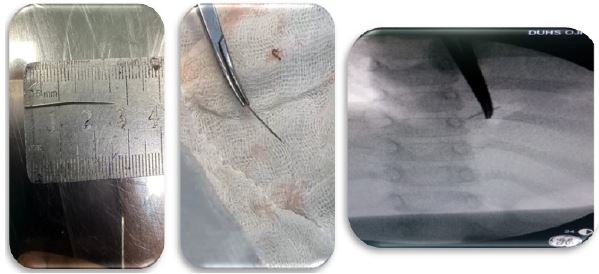 On examination, the child was alert and active, sitting comfortably with no notable signs of distress. There was a 3 x 2 cm closed wound present on the mid-anterior chest wall, with positive tenderness around the wound site, and no visible discharge. Complete cardio-vascular and chest examinations presented no abnormalities with normal breath and heart sounds. The patient had non-significant findings related to other organ systems, with no prior history of any birth-related or congenital diseases. Chest x-rays, AP and Lateral views, carried out previously in their home town demonstrated a slender radio-opaque object, present behind the lower sternum, which corelated with the mother’s report of an accidental injury with a sewing needle.